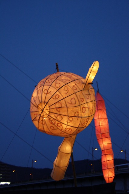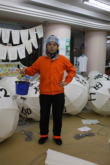 日比野さんは船の前後につける、ぼんぼりに協賛していただいた企業名を書いておりました。