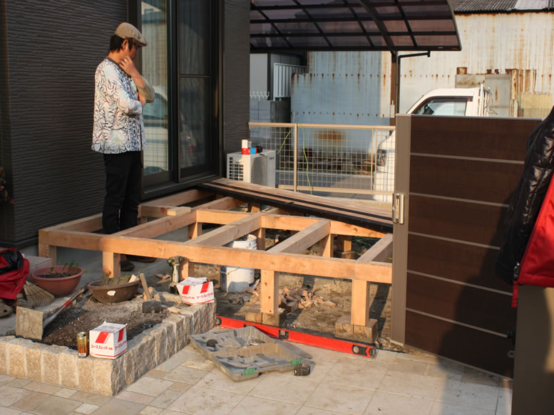 犬も飼いたいとのことで、m28eオリジナル犬小屋に、焼き板まじりのウッドデッキをつくります。