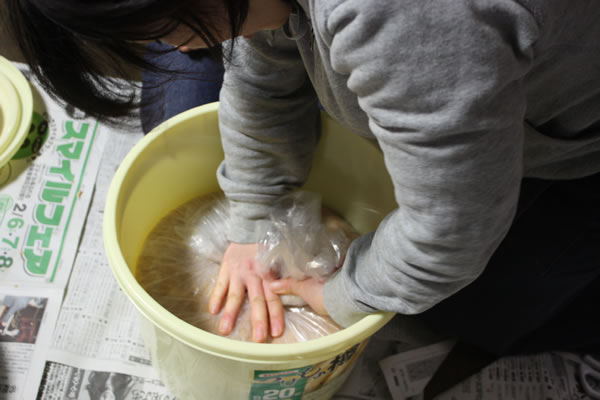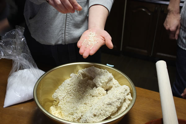 まず、固まっている麹(こうじ)を、手をすり合わせて、砕きます。