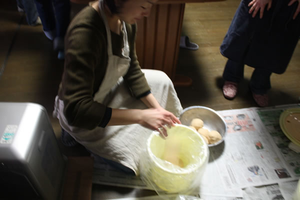 ボール状のみそを桶に勢いよく投げます。これで空気を抜くんだって。