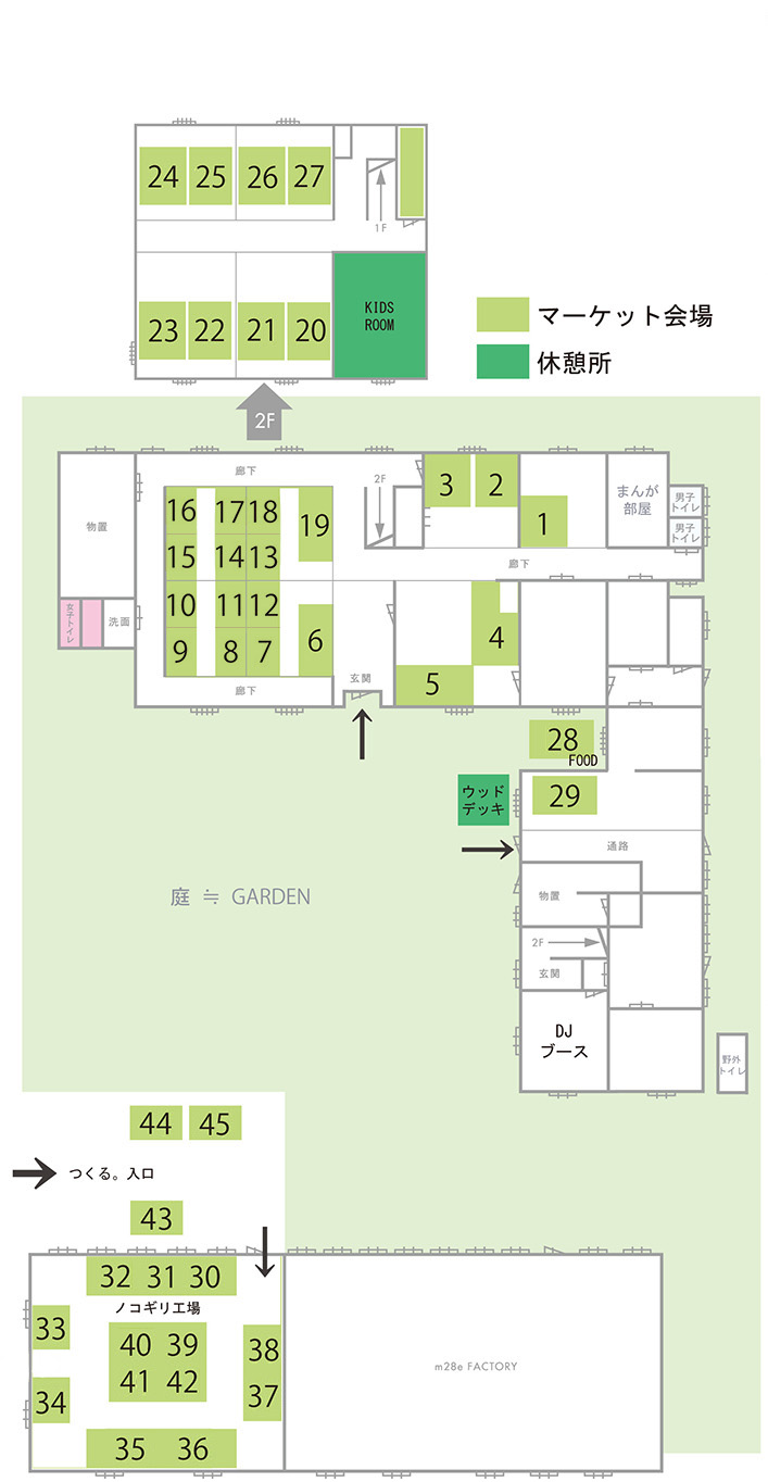 ノコギリ工場: 13ブース [ およそ 180 ㎝× 180 ㎝ 土足可能な板 ]、