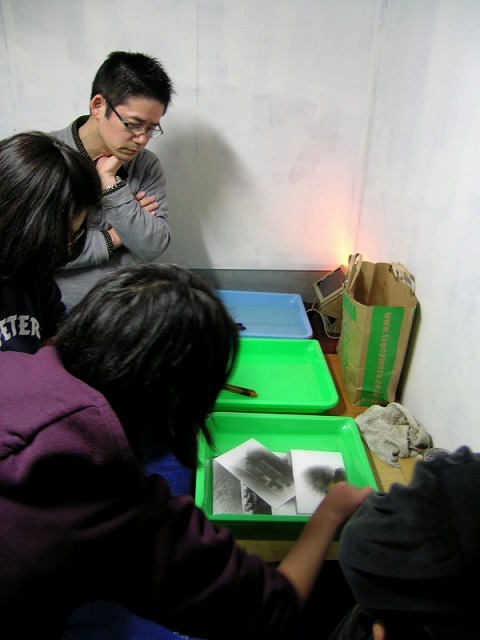 ↑暗室の中で現像中。