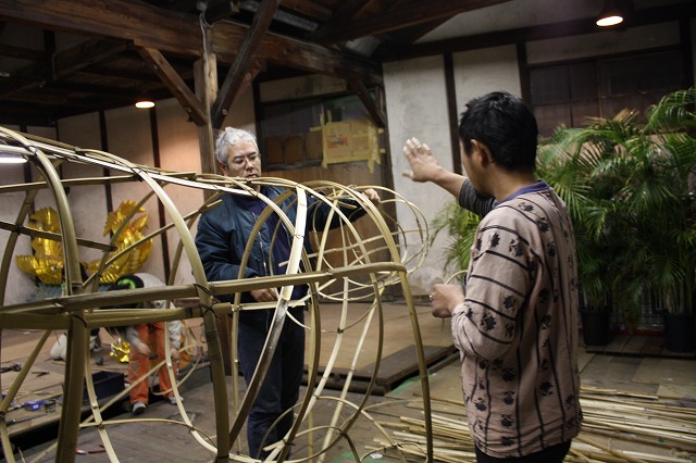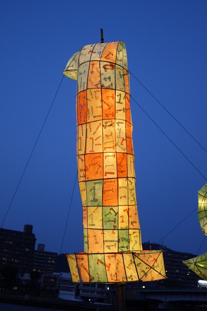 日比野さんは船の前後につける、ぼんぼりに協賛していただいた企業名を書いておりました。