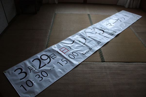 横断幕を作りました。つくる。マーケットのときに飾るためのものです。