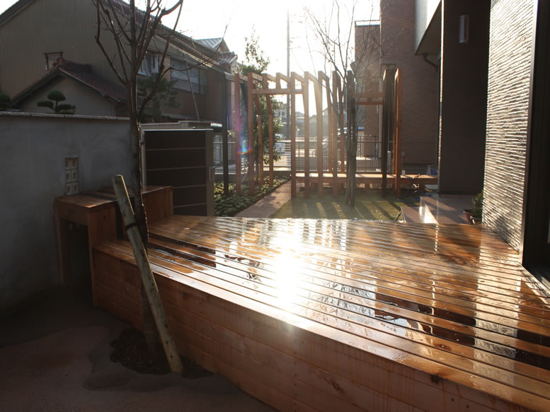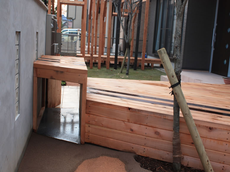 まずは、家の中から外に出られるウッドデッキは、犬小屋とも合体。
