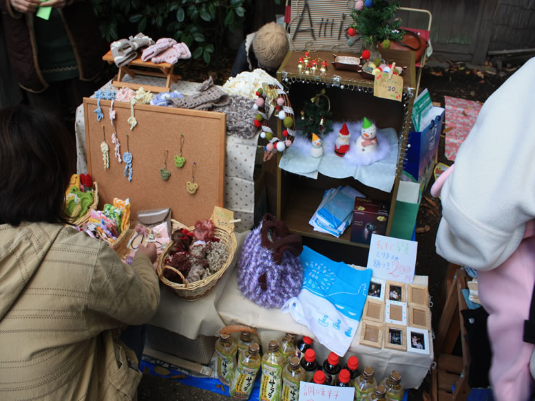 私は、例のごとく、だんなの会社の賞味期限直前の特価調味料とこよみのよぶねのてぬぐい、チェキで写真を撮る(額つき:自分でガラス絵の具で模様をつけたのよん。)をやりました。お仲間二人は手編みでマフラーやエコタワシ、手袋、シュシュなど数々の手作り作品を出展。