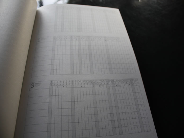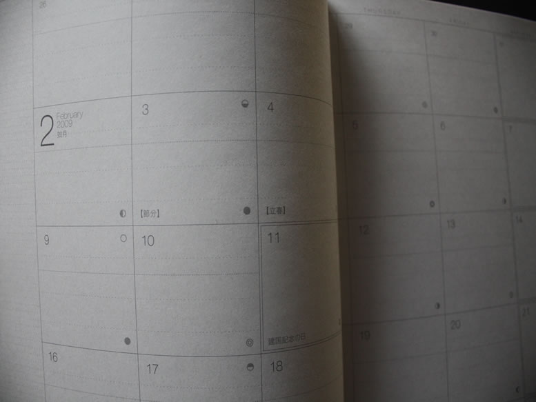 続きまして、月のカレンダー。見開きで1か月の予定が書き込めます。