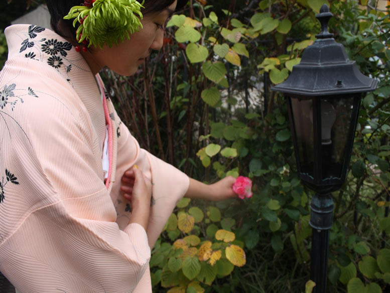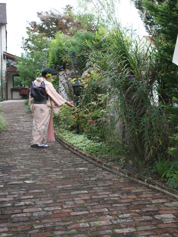 和服姿がなぜか、洋風な庭なのに、似合ってしまう。