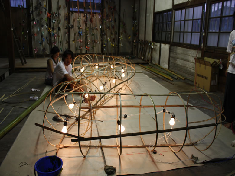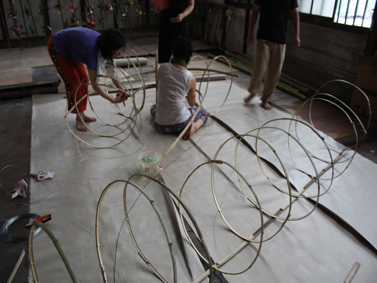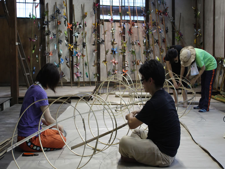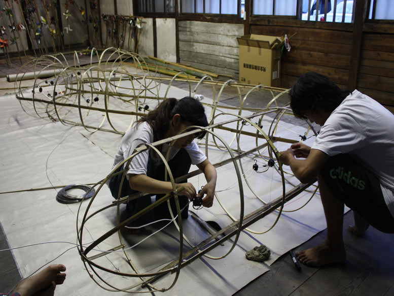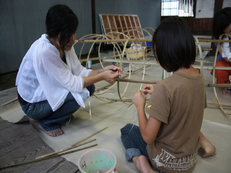 そこで、こよみのよぶね2008のリーダーのヒビユカちゃんと一緒にこの日は行灯の骨組みを作りました。
