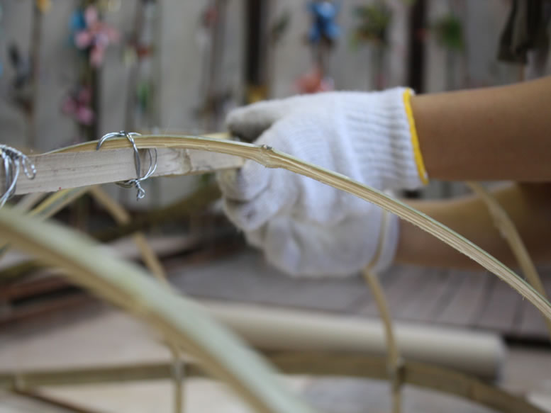 こうして、針金で丸く結んだ竹をさらに針金でつなげていきます。