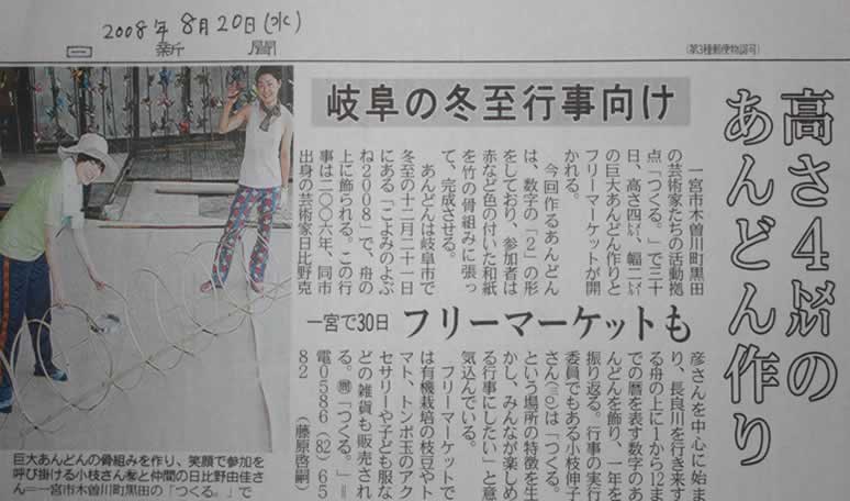 こよみのよぶねは冬至の日に巨大行灯を作って、長良川に流すという行事です。行灯に和紙をはるということを当日はやろうと思っています。