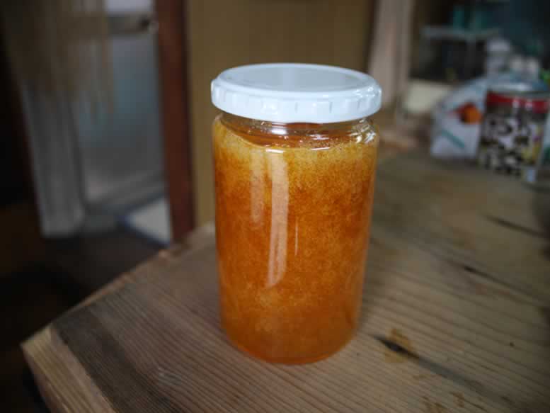 早速、月曜に収穫した梅の悪いところを包丁でとり、煮て、種をとって、種を除いた梅の分の約8割の砂糖をいれて、煮て、熱いうちにジャムの瓶に入れました。